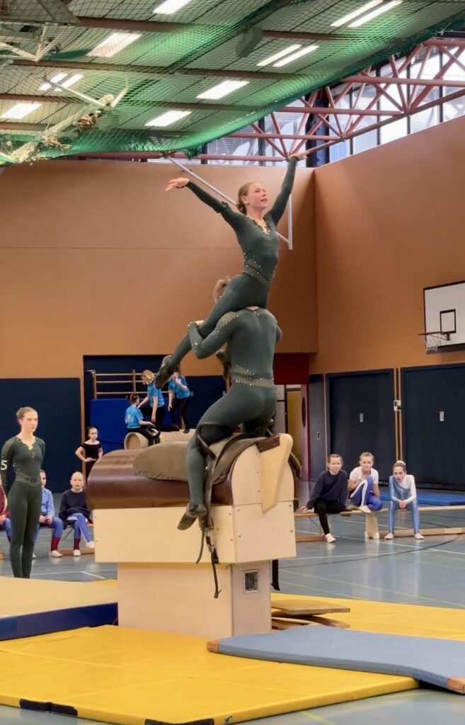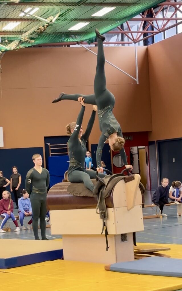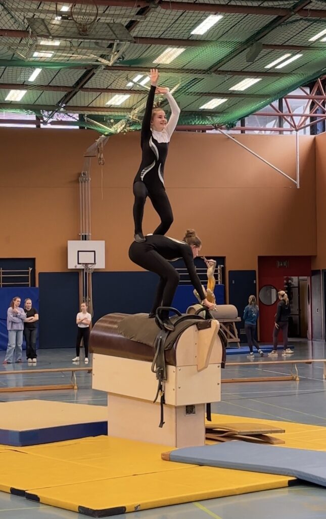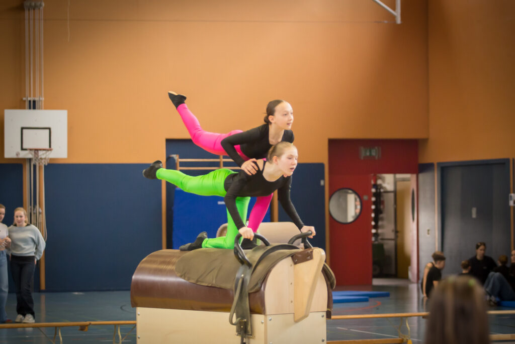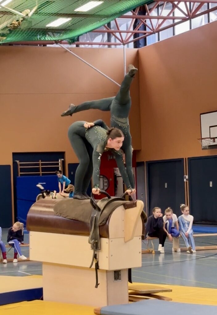 Im Anschluss gingen Hanna und Mayla, ebenfalls aus dem A-Team, zum ersten Mal als Junior-Doppel an den Start. Die Aufregung war auch hier deutlich zu spüren. Dadurch wirkte die Kür stellenweise etwas hektisch, dennoch zeigten die beiden eine gute Leistung und wurden mit einer Wertnote von 6,103 und dem 2. Platz in der zweiten Abteilung belohnt.