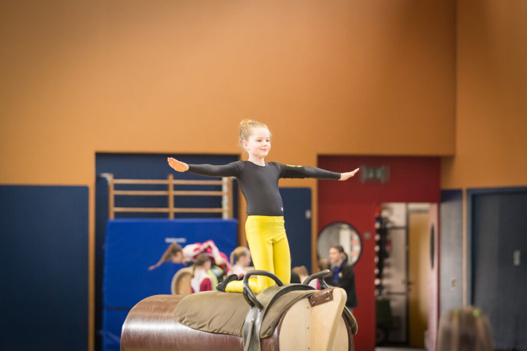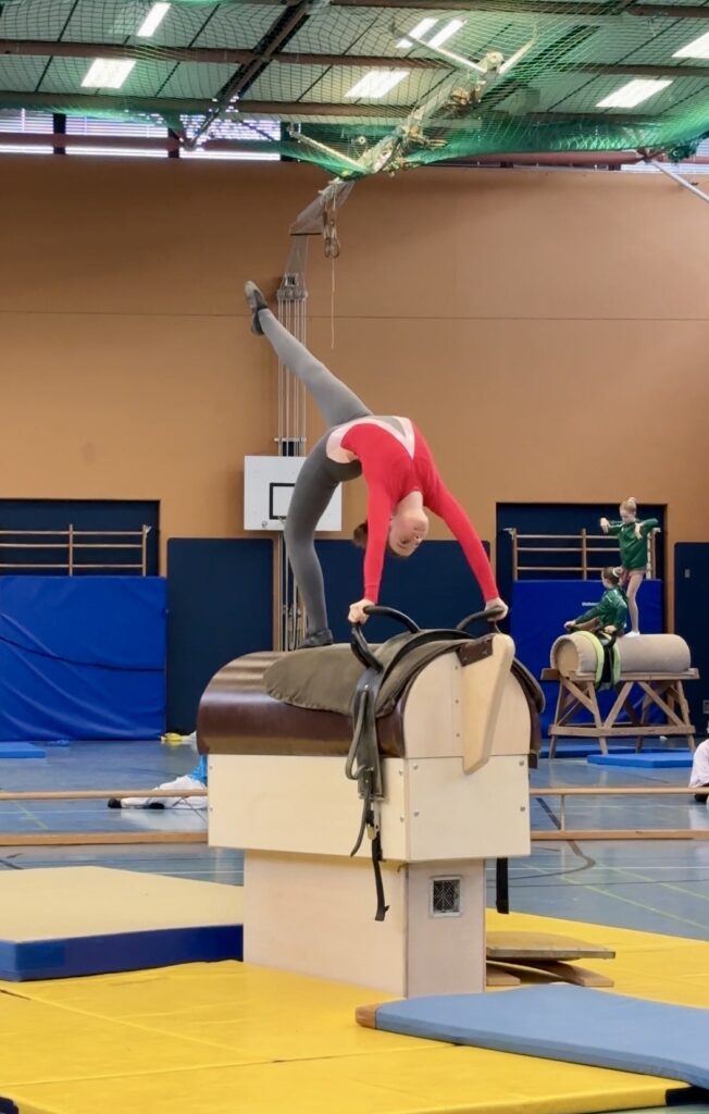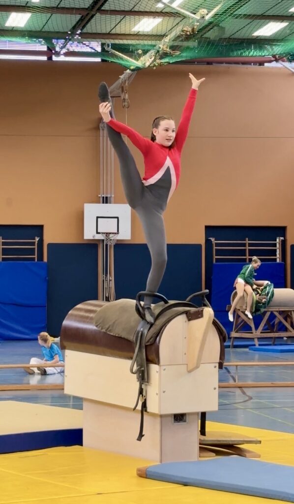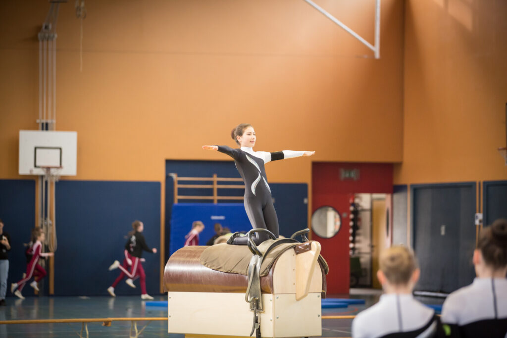 Nach der Mittagspause wurde es für Lena aus dem A-Team spannend: Sie absolvierte ihren ersten Einzelstart. Trotz großer Nervosität präsentierte sie ihre L-Kür zur Musik aus dem Film „The Greatest Showman“ ohne Patzer. In einem starken Starterfeld erturnte sie sich mit einer tollen Wertnote von 6,467 den 5. Platz. Für zukünftige Einzelstarts wollen wir vor allem weiter daran arbeiten, die Nervosität abzulegen und noch mehr Leichtigkeit und Souveränität während der Kür zu zeigen.