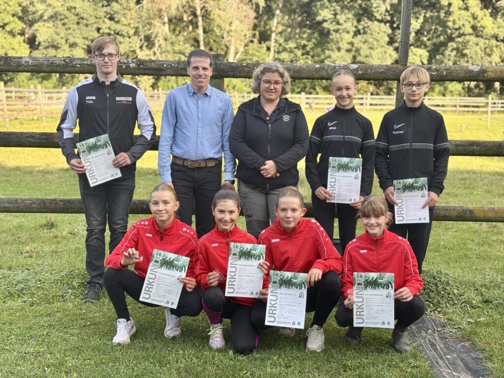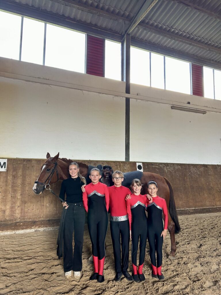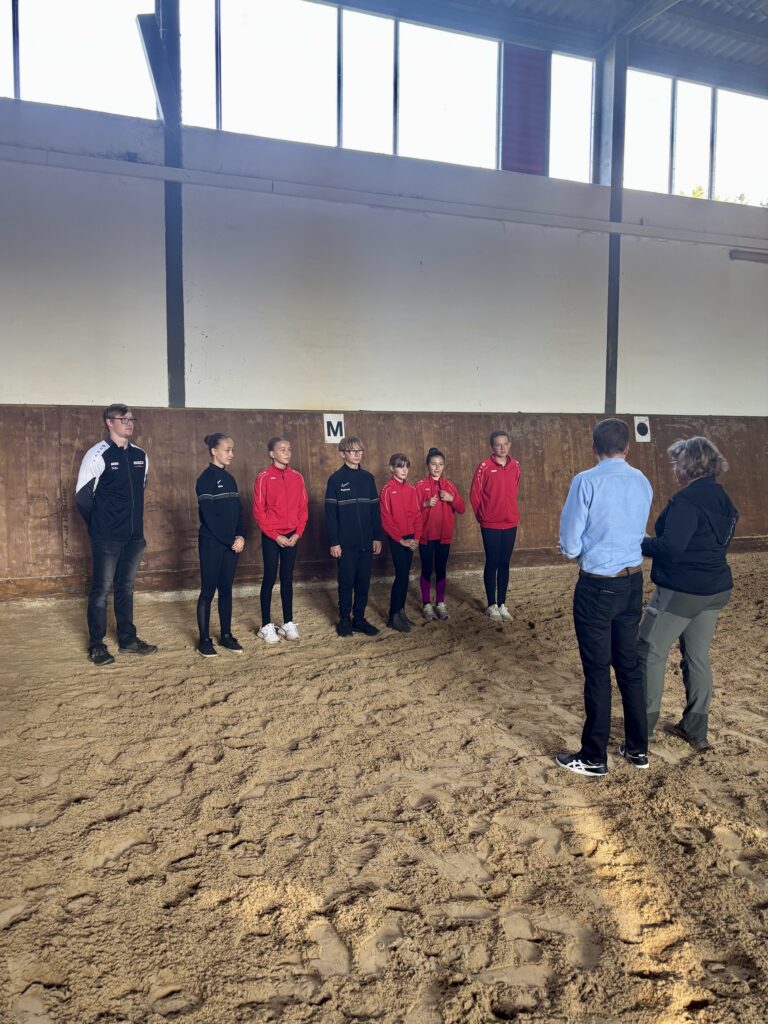Auch die insgesamt sieben Anwärter auf ein Voltigierabzeichen haben gezeigt, was sie über den Sommer gelernt haben. Stella, Mayla und Magdalena zeigten auf ihrem Pferd Diana die E-Pflicht (VA 5) und konnten sowohl beim Voltigieren als auch in der anschließenden Theorieprüfung überzeugen. Ebenfalls mit auf Diana war unser Raphi, der sogar das VA 3 mit der L-Pflicht ablegte. Weiter ging es mit Voltigierern aus unserer zweiten und dritten Turniermannschaft auf Isis. Hier legten Mia und Nils erfolgreich das VA 4 mit der A-Pflicht ab und Maya ebenfalls das VA 3 mit der L-Pflicht.