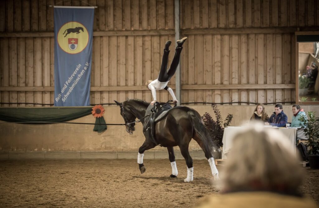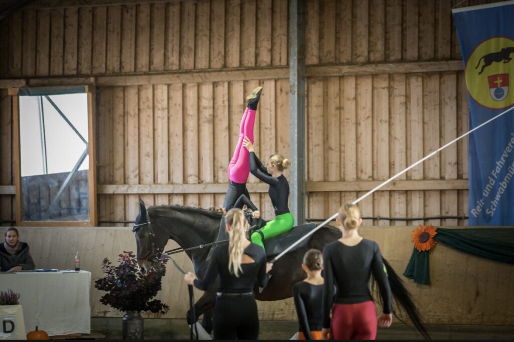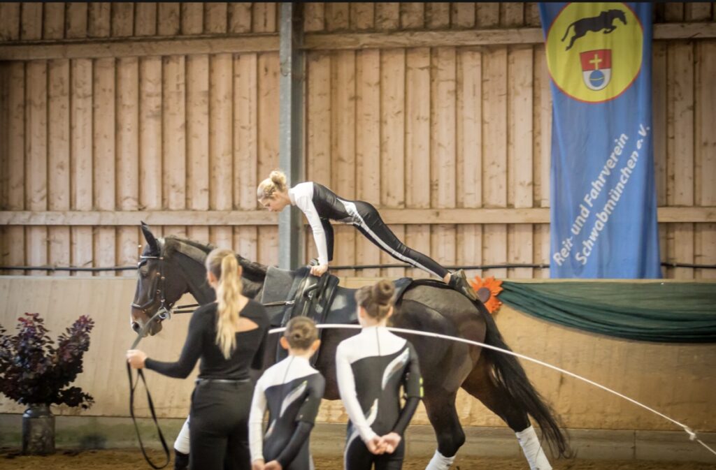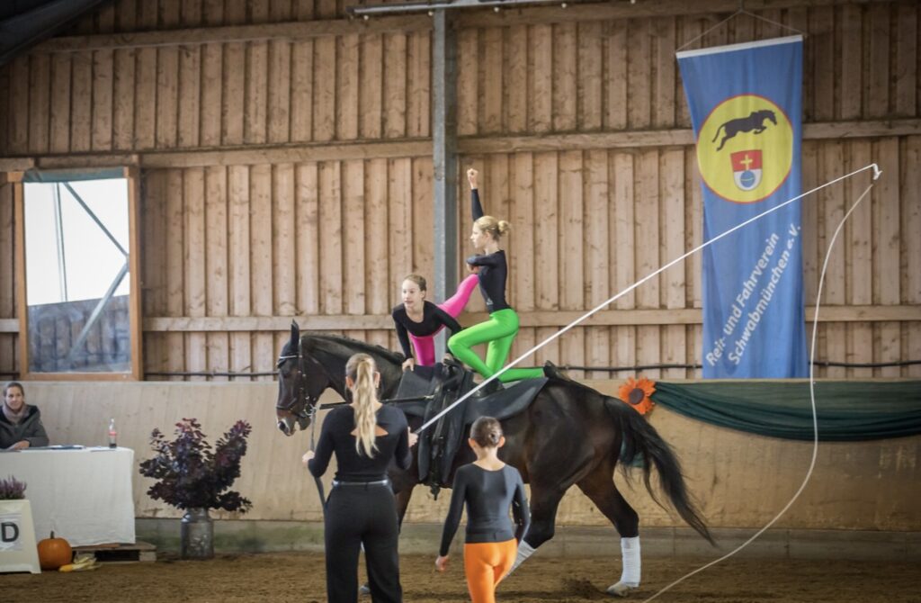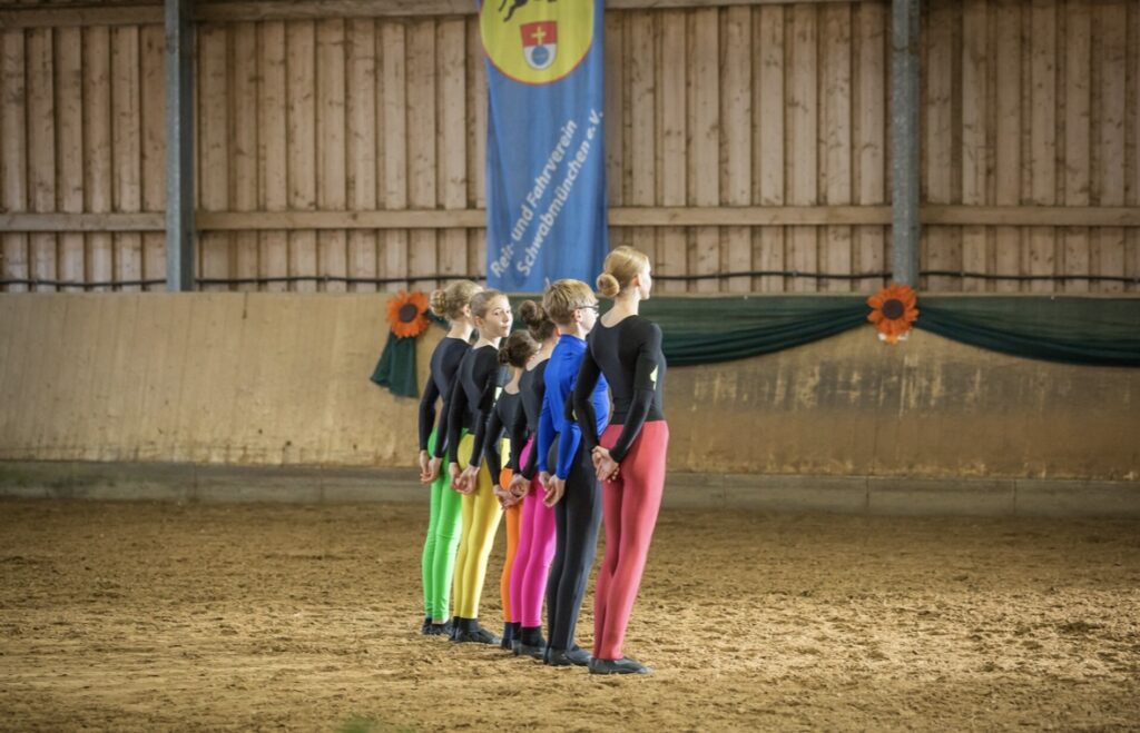Am Samstag den 11. Oktober machte sich unsere TG 3 bereits sehr sehr früh am Morgen zusammen mit Gruppenpferd Dobby nach Schwabmünchen auf, um dort ein weiteres Mal unter den A Gruppen an den Start zu gehen. Gemeinsam mit Ina an der Longe turnten sie eine solide Pflichtrunde und konnten sich in der Kür sogar noch einmal verbessern und ihre Trainingsleistung sogar übertreffen. Am Ende erreichten sie nicht nur den ersten Platz in der zweiten Abteilung, sondern auch eine Aufstiegsnote von 5,911.
