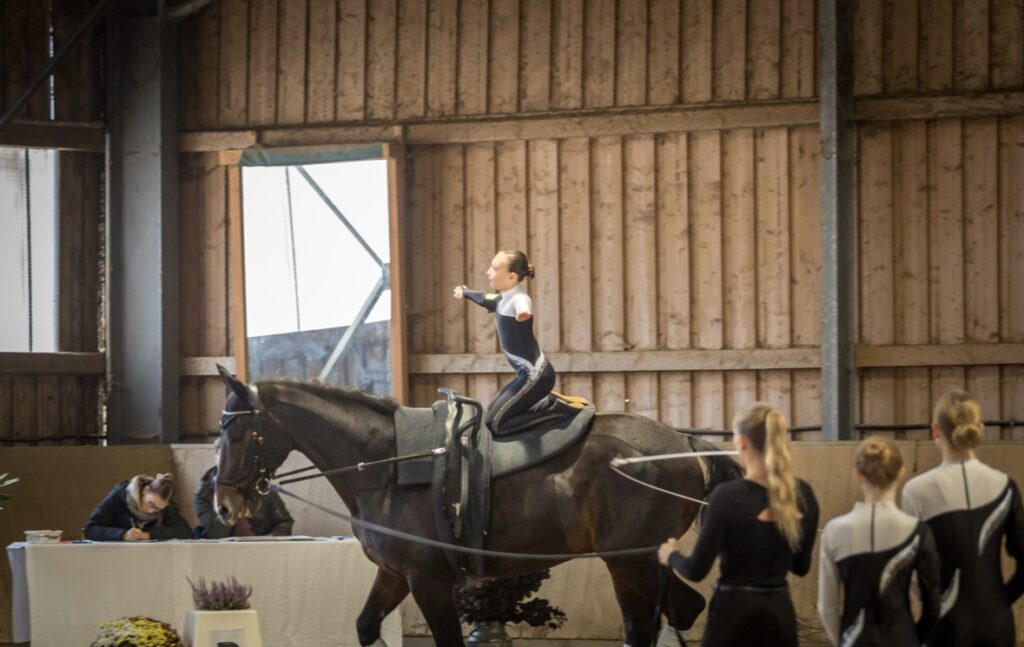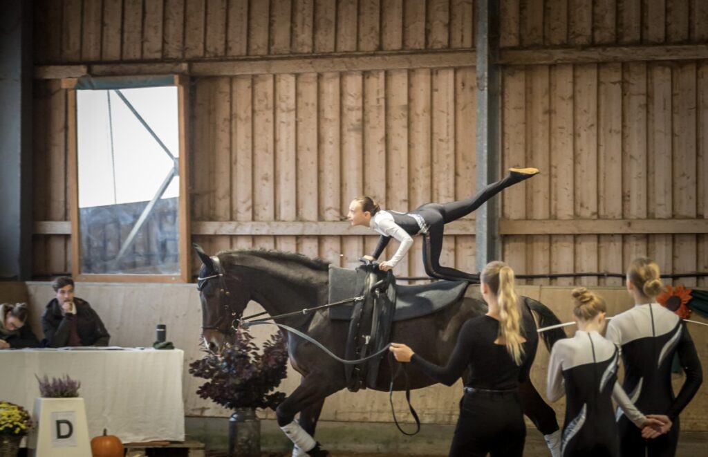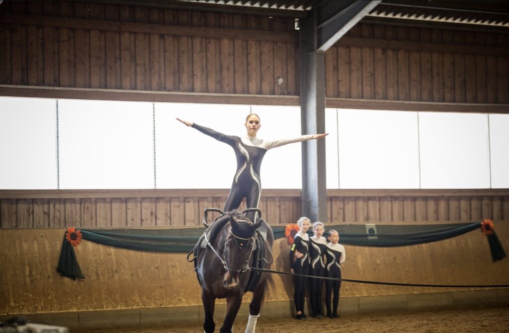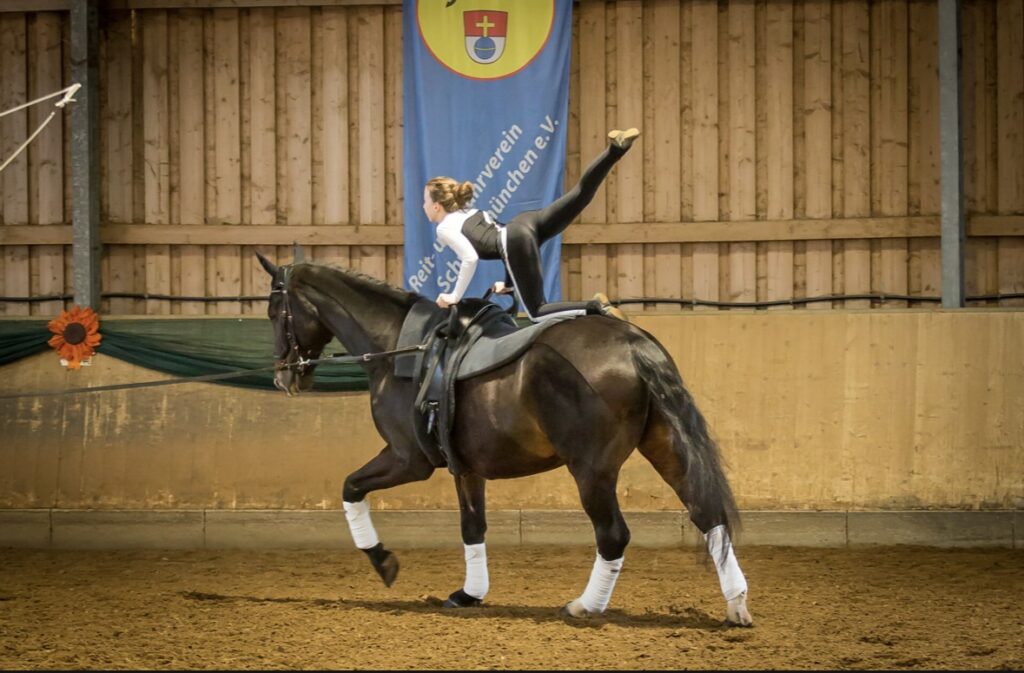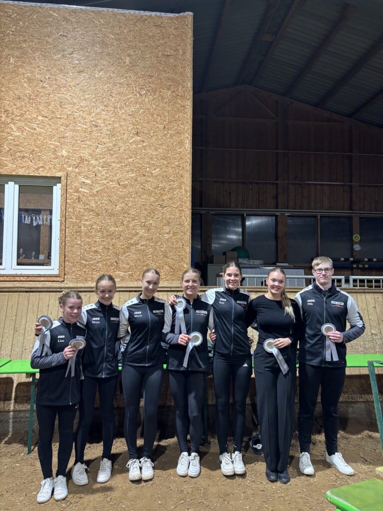 Am Samstag den 11. Oktober machte sich unsere TG 3 bereits sehr sehr früh am Morgen zusammen mit Gruppenpferd Dobby nach Schwabmünchen auf, um dort ein weiteres Mal unter den A Gruppen an den Start zu gehen. Gemeinsam mit Ina an der Longe turnten sie eine solide Pflichtrunde und konnten sich in der Kür sogar noch einmal verbessern und ihre Trainingsleistung sogar übertreffen. Am Ende erreichten sie nicht nur den ersten Platz in der zweiten Abteilung, sondern auch eine Aufstiegsnote von 5,911.