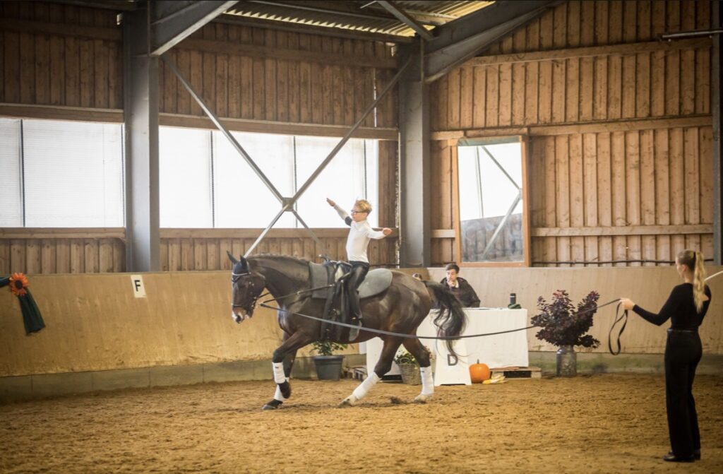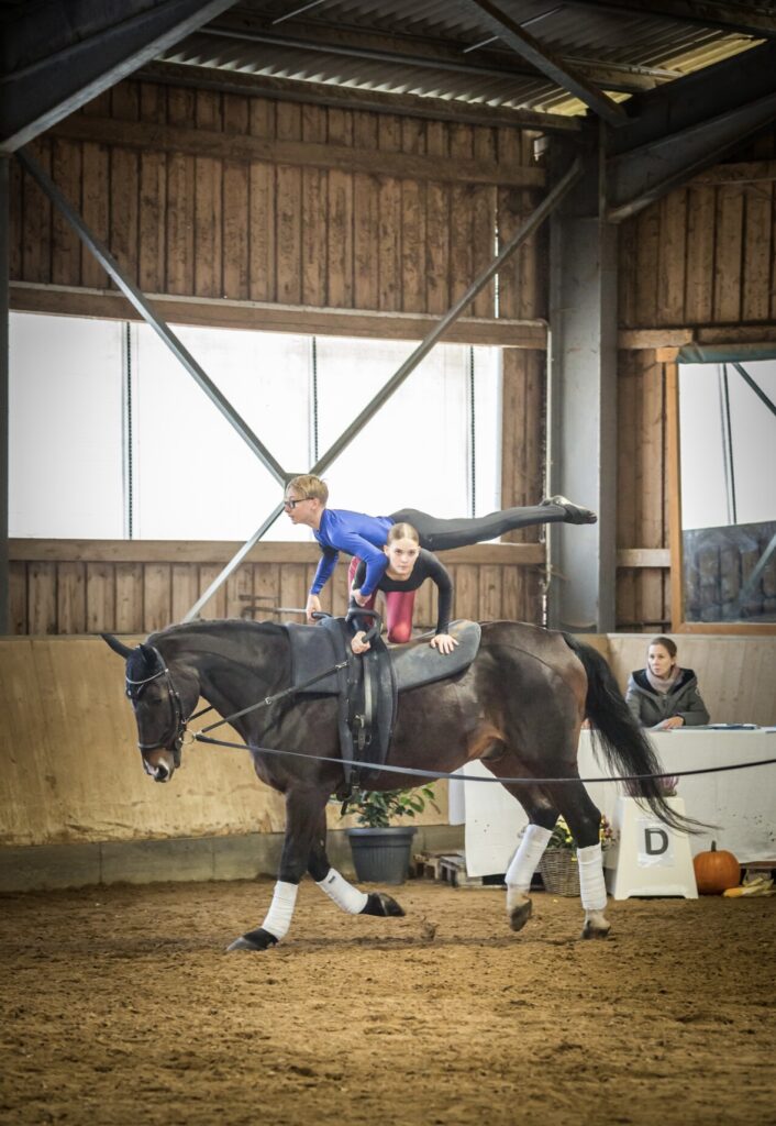 Gegen Mittag traf dann unsere TG 2 für ihren allerletzten Start als L-Gruppe ein. Zum ersten mal ging es für die Gruppe gemeinsam mit Isis und Ina an der Longe in den Prüfungszirkel. In dieser neuen Konstellation ging es vor allem darum, Routine zu sammeln und mit einem guten Gefühl in das Wintertraining zu starten. Kleinere Patzer in Pflicht und Kür bescherten insgesamt zwei mehr oder weniger zufriedenstellende Runden, die am Ende mit einer Note von 5,935 für den zweiten Platz in der ersten Abteilung reichten.